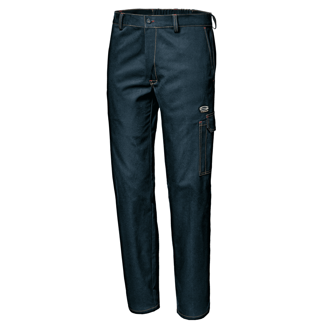 100% Massaua "beavatott" pamutból, 280 g/m². Tripla varrás a lábak külső oldalán. Két ferde zseb; egy oldalzseb tollzsebbel a bal, és egy colostok zseb a jobb lábszáron; egy darab gombos farzseb; rugalmas derékrész. Mechanikai hatásoknak ellenálló.