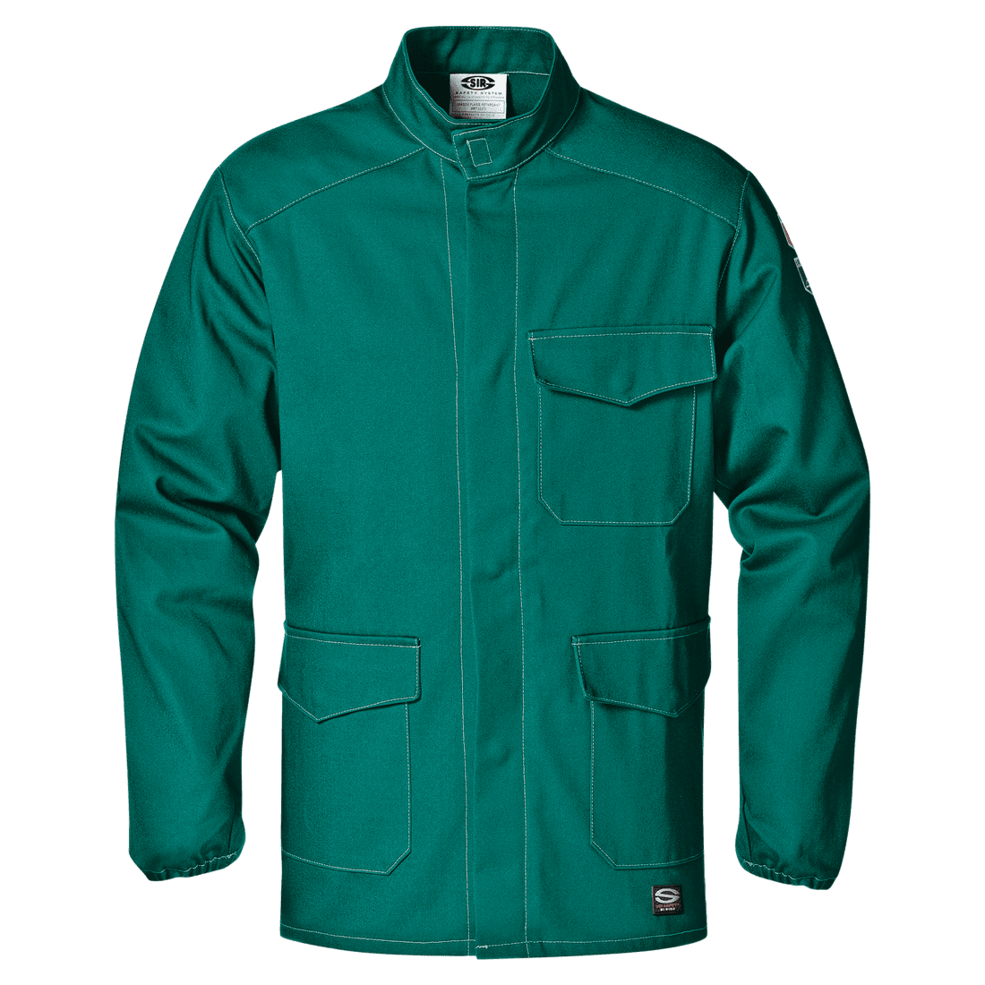 100% lángálló pamutból (315 g/m2) készült dzseki tépőzáras, mandarin gallérral, rejtett cipzárral, rugalmas mandzsettákkal. Két fedett, patenttal záródó oldalsó és egy mellzseb.