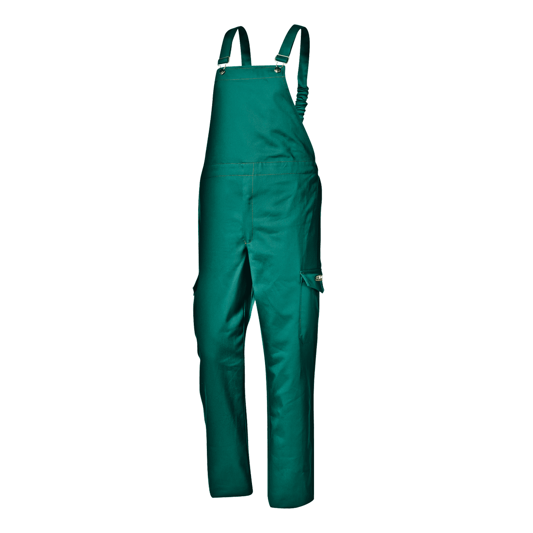 100% lángálló pamutból készült, kantáros nadrág. Rejtett, fém cipzárral; két fedett, tépőzáras oldalsó zsebbel; egy jobboldali farzsebbel; rugalmas derékrésszel és oldalsó fémgombolással; rugalmas vállpántokkal és fém csatokkal.
