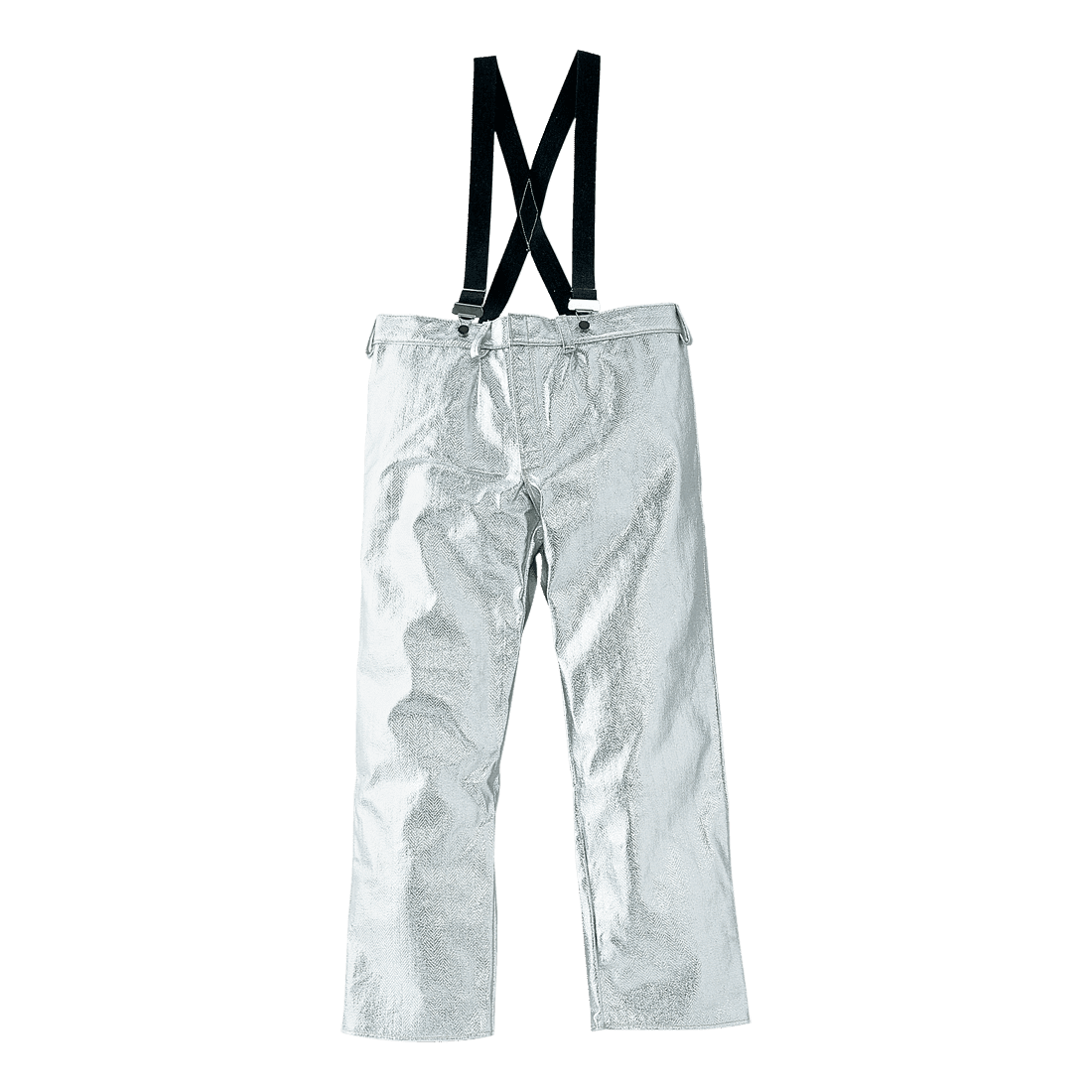 Magas mechanikai védelmi, és hőálló képességgel rendelkező, alumíniumizált para-aramid szálból készült nadrág, rejtett gombolással, övtartóval, és állítható vállpántokkal.